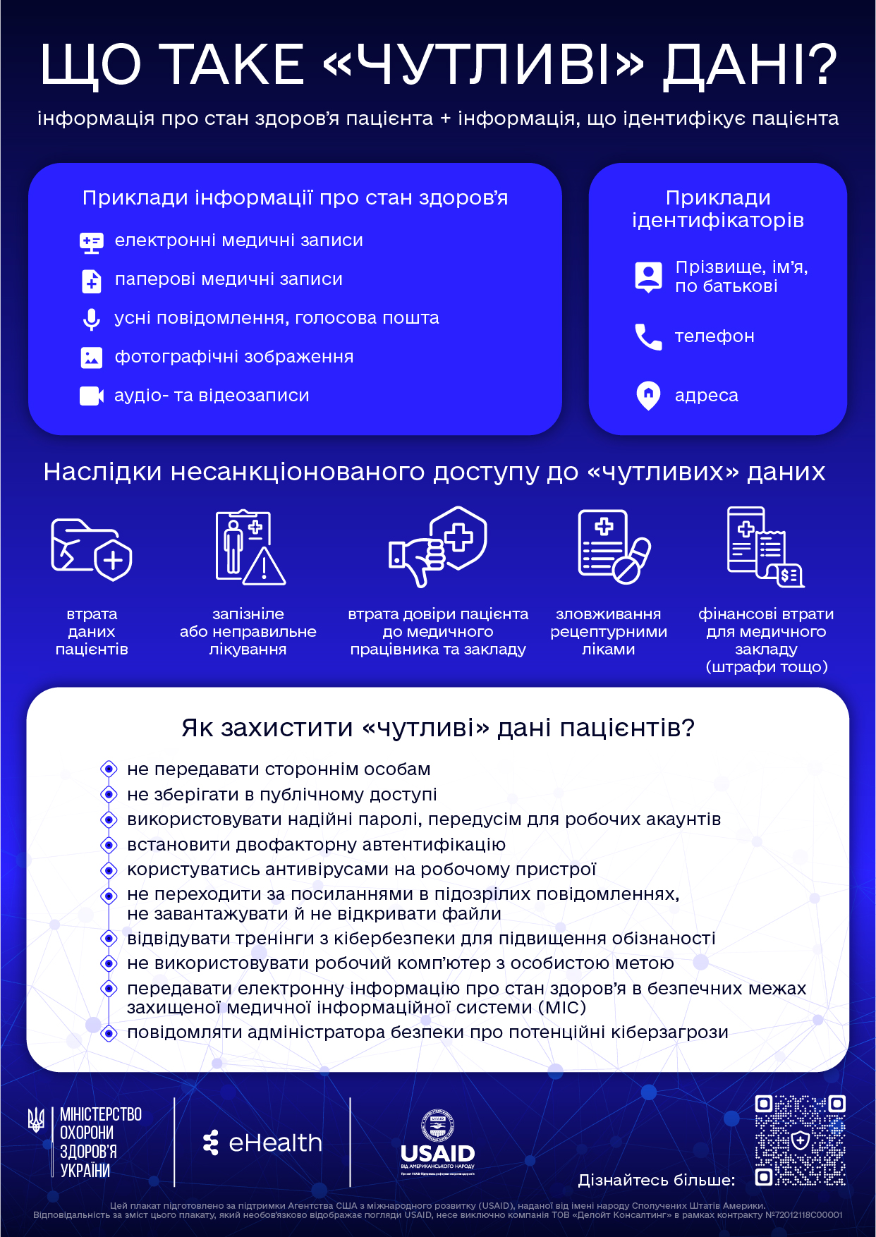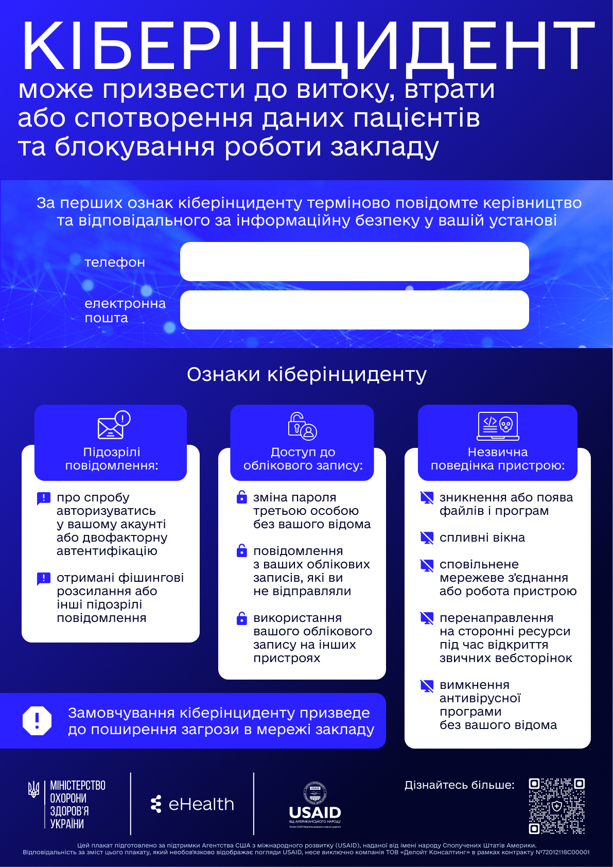 Міністерство охорони здоров’я за підтримки проєкту USAID «Підтримка реформи охорони здоров’я» сформувало бібліотеку матеріалів, що допоможуть лікарям, медичним сестрам і братам, управлінцям, адміністраторам медичних закладів та всім зацікавленим партнерам отримати основні знання про види і форми кіберзагроз та чіткі рекомендації щодо боротьби з ними.