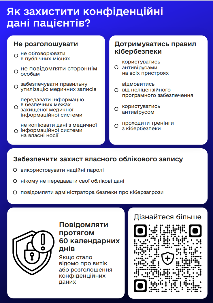 Ознайомтеся з простими правилами кібербезпеки в медичному закладі на сайті МОЗ в розділі “Кібербезпека” – “Кіберзахист” HTTPS://MOZ.GOV.UA/KIBERZAHIST